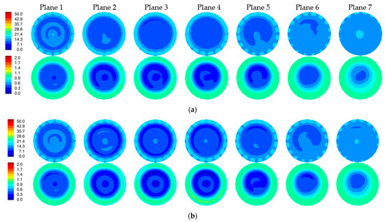 Reconstructed 2D 1300 MHz permittivity (top) and conductivity (bottom) images for all seven planes of the simulated breast phantom for the cases with (a) and without (b) the skin layer, respectively.