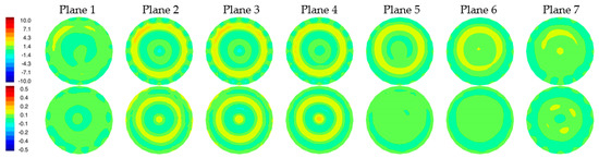 Figure 9 shows difference images between reconstructions with and without the skin layer (Figure 8a,b). A ring of elevated permittivity appears where the skin layer is located (the color scale has been compressed to accentuate the small increase). The corresponding conductivity difference images exhibit similar elevated property rings for some planes but with artifacts in the center of the field of view. Overall, differences are small, but the algorithm is sufficiently sensitive to recover these features even when the associated scattered field input measurements demonstrate very little change.