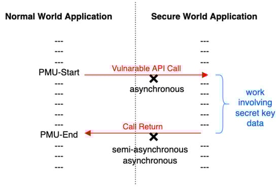Now imagine that although the TA is invoked by the CA through a synchronized call, the non-determinism exists in the computation activity preceding the actual encryption and encoding. Similar non-determinism may exist at the termination end of TA as well. Hence, neither end needed for PMU trigger is predictable. This is the asynchronous model.