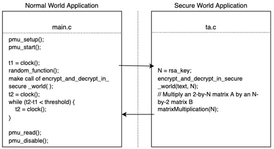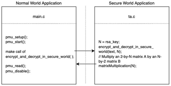In the normal world, we access PMU perf_events in user space without kernel privilege, which serves as the receiver. The sender is a secure world application. Running in the kernel space enables it to send information that is not available for user space processes. As shown in Figure 2, we have inserted a decoding program into the TA part of the application whose execution time depends on the leaked value and length of private key fragment. That means the user space PMU counter readings will be affected by the information we want to steal.