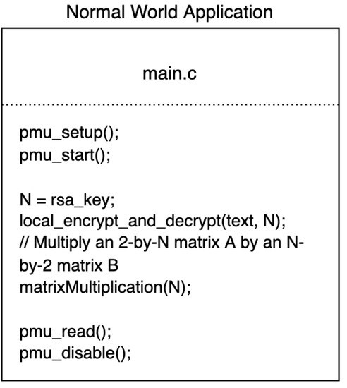 Specifically, the procedure embedded in the TA is a simple matrix multiplication program listed below. With input N, the program multiples a matrix A with another matrix B and the result is stored in a matrix C. Here, the integer N is the encoded RSA secret key value fragment ranging from 0 to 1024 which is accessible to the TAs running in the secure world. To exfiltrate the entire secret key, the encoding procedure takes more than 12 rounds depending on the RSA key’s length.