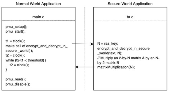 TrustZone-based TEE solutions can provide the functionality to support cryptographic operations. The cryptographic operations include secure key generation, key derivation, symmetric, and asymmetric cryptographic operations [29]. This study first implements cryptographic operations such as RSA or AES in a normal world application. Then, we train our machine learning prediction model based on the data collected from PMU readings of the normal world application. The data is collected from the normal world because it is not always feasible to collect the data in the secure world. This offers a more general paradigm where the training model is based on the mirrored state in the normal world, but works fairly well to infer the secure world states. This subverts many of the secure world defense mechanisms. The machine learning model trained on normal world state achieves high accuracy in secure world state predictions. The next step is to apply the trained model to detect secure key bits that are generated in the secure world.