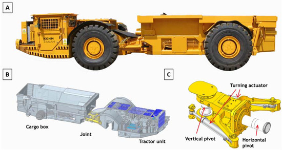 Machines working in underground environments are adapted to operations in difficult conditions. One such machine is the haul truck (Figure 1A), which was designed for high capacity along with maneuverability. This is the reason why this particular type of machine consists of two main parts: the driving (tractor) and transport (cargo box). These two parts are connected by the joint, as shown in Figure 1B. The joint of a haul truck (Figure 1C) has two degrees of freedom. The turning mechanism is based on two hydraulic cylinders installed between the two above-mentioned working parts. This design solution allows for crossing intersections at an angle of 90 degrees. The joint is one of the most important structural nodes and its damage is one of the most costly and dangerous. Its reliability mainly depends on the quality of workmanship, while the main cause of their failure is dynamic overload. Damage to the horizontal joint is particularly critical, leading to the machine being halved in extreme cases. Joint failures have fatigue nature and begin with micro damages that propagate as a result of high-impact dynamic overloads. Ultimately, the micro damages turn into cracks in the structure, leading to permanent damage to the joint. Predictive detection of such malfunctions is the core of the research presented in this article.