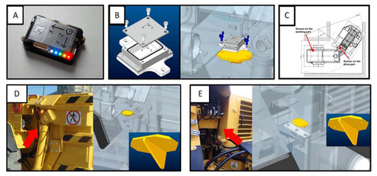 Data acquisition layer—main components: (A) NGIMU sensor unit; (B) Steel housing of the device and the method of installation on the machine; (C) Positions of the sensor marked with red dots; (D) Exact location (red arrow) of the sensor on the back of the machine; (E) Exact location (red arrow) of the sensor on the front of the machine.