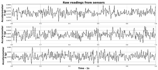 As mentioned before, dynamic overloads (most probable cause of researched damage) are closely correlated to the vibrations affecting the machine. For this reason, only the accelerometer readings were taken into account. In standard situations, a uniaxial accelerometer is used to measure vibration (e.g., [22]). In this case, however, as the sources of vibration are dynamic and occur both outside and inside the machine, all 3 axes were used. One second sample of all accelerometer axes readings is presented in Figure 4.