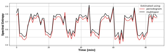 Comparison of spectral entropy estimated with the use of a periodogram and multitaper.