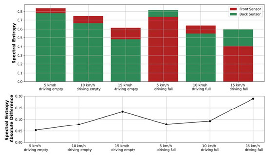 As mentioned earlier, the research presented in this article assumes the use of spectral entropy to analyze data from IMU sensors installed on haul trucks working in underground mines. This measure is highly dependent on several factors, the main ones being operator, speed, operation performed and the machine itself. These elements can create large differences between front and back readings, hence the need to take the difference between them. An example of these influencing factors is shown in Figure 6, where entropy was calculated with respect to machine speed and box status (empty/full). The upper graph shows a bar graph of the spectral entropy of vibrations measured at the front and back of the vehicle, depending on the factors while driving. It can be seen that the entropy values decrease with increasing velocity. The lower graph shows the absolute difference in entropy values between the front and rear of the vehicle. The entropy difference fluctuates, and its absolute value does not exceed 0.08. Thus, it can be concluded that, while the values of the spectral entropy may depend on various factors, the difference in spectral entropy between the front and back does not depend on such factors.
