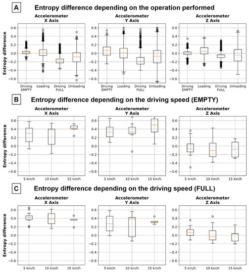 The difference of spectral entropy is shown in Figure 7 as boxplots with regard to operation performed and driving speed, divided into 3 accelerometer axes. Figure 7A shows the value of the entropy difference depending on the operation of the working cycles of a single machine. As the accelerometer in the Z axis should show the greatest correlation with the researched problem, the moments of driving with an empty/full box were selected as the best states for the analysis. When analyzing the other axes, it can be noticed that they have much larger possible positive values of the entropy difference (even over 0.6) than the Z axis (maximum 0.4). In addition, in most cases, there is a trend related to machine speed, which causes the values of the entropy difference to be more concentrated at the lowest and highest values.
