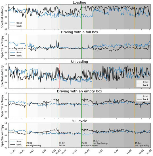 When analyzing the entropy values of accelerometer Z from machine 006/A, some correlations to recorded events are visible. This is shown in Figure 8, where entropy values are computed over time with respect to the operation performed. The graphs show the value of entropy measured at the front and back of the vehicle, separately for the cases: loading, driving with a full box, unloading, driving with an empty box and the full cycle, i.e., without distinguishing between operational components. The event related to the maintenance of the joint has also been marked with vertical lines. It can be seen that for most events recorded, there is an increase in the difference between the back and front sensors in the days before such an event. This is especially seen in driving with an empty box operation. At critical moments, this difference is so large that it reaches 0.2, which is about 33% of the standard value. The value of the difference is usually higher before the event; however, one recorded replacement of the nut caused an increase in value that was later compensated for by tightening the nut. This behavior was not observed in healthy machines. The differences between back and front sensors did happen, but not on such a scale and they did not persist for longer times.