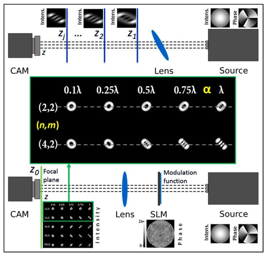 Principle of operation for determining the vortex TC (l = 3) in a standard way (upper part) using a tilted lens and detecting the intensity distribution in several planes (z1, z2, …, zj) and the proposed approach (lower part) based on multi-channel DOE matched with astigmatic aberrations of different levels α in a single focal plane z0.