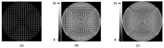 where parameter is a pseudo-random value and S is the number of pseudo-random numbers from the segment [−0.5; 0.5].In a number of numerical experiments, it was found [66] that the best correspondence between the intensity distribution in the focal plane for the amplitude-phase element of Equation (10) and for the phase element of Equation (12) was achieved with the parameters of the partial coding method S = 5 and = 0.1. Figure 2 shows the phase (Figure 2c) of the phase-coded multi-channel DOE of Equation (12).