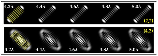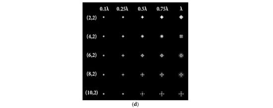 As can be seen from the results, the classic type of astigmatism (2, 2) (first column of Table 7) provided better pictures compared with other types of aberrations. More detailed simulation results for level α from 4.2λ to 5λ are shown in Figure 4.