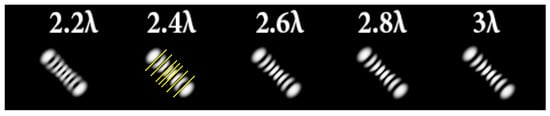 The best results were obtained for the astigmatic aberration of type (4, 2) (second column of Table 6). Figure 3 shows, in more detail, the simulation results for this type of aberration at a level of α from 2.2λ to 3λ, obtained by analyzing a vortex beam with TC l = 7. For clarity, dark intensity lines between light intensity extrema were indicated with yellow lines (the number of seven lines corresponded to l = 7). Figure 3 clearly shows that with an increase in the aberration level α, the distance between adjacent extrema increased, which allowed for it to be possible to more confidently detect the TC.