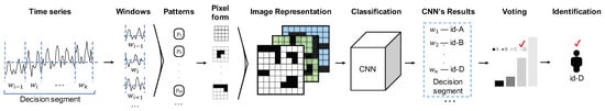 The user identification that we propose in this paper follows a pipeline that is inspired by the pipeline presented in [], where the identification was obtained in two steps. First a machine-learning classification is performed over the instances of the input time series, where each instance corresponds to non-overlapping windows. Then, the final identification is produced based on a voting mechanism among predefined decision segments that contain a number of windows of the time series. The key difference in our case is the image representation process, which takes the time-series data and transforms it into images that are then fed into the machine-learning-classification method. As a classification method, we consider a convolutional neural network (CNN), since CNNs have proven to be particularly well-suited in dealing with image data [].