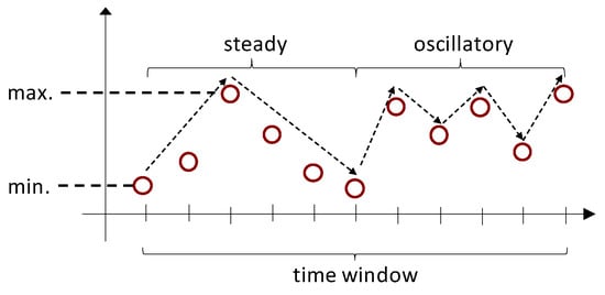 For the computation of the variation patterns, the window is divided into consecutive non-overlapping segments, according to the type of variation. Each segment spans not less than three data points in order to be able to distinguish if the transitions between data point values indicates a steady or a oscillatory variation. The value of the variation v is then computed for each of the segments, according to the formula in Equation (1), where corresponds to a value of a data point at step i and to the value at the previous step.