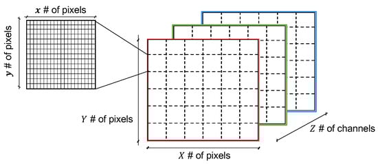 For each window in the time series, we generate one raster image or bitmap [], either black and white (B&W) or color (RGB). Our goal is to combine the patterns values found within a window into an image. For that purpose, we define an empty bitmap of number of pixels and Z number of channels, divided into several regions of number of pixels, where each region is meant to represent one pattern value. This is illustrated in Figure 3. For this paper, we consider for the single-channel (B&W) case, an image divided into 36 () regions, where x and y are the same for all regions.