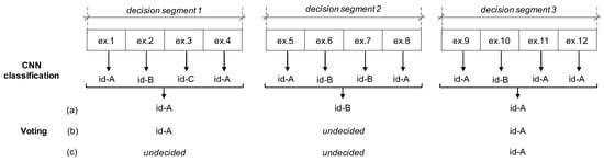 For the classification part of our approach, we follow two steps. First, we use a convolutional neural network (CNN) to obtain a tentative class for each example in the data that corresponds to a window within the time series. Then, we define decision segments, which divide the time series into chunks of the same number of windows. Finally, we apply a voting mechanism, according to a predefined criteria, to decide the class for each of the decision segments and consequently for the examples within.