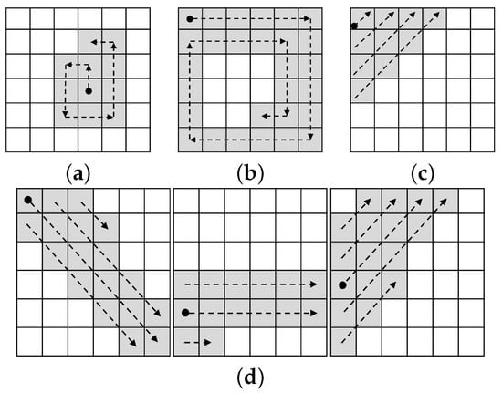 We consider four different filling strategies for our evaluation. These strategies refer to different ways in which to mark contiguous pixels according to a predefined path. The strategies that we consider are aimed at producing images with well-localized and distinguishable edges that can be easily reproduced. Next, we describe each of the filling strategies that we consider, which are illustrated in Figure 6.