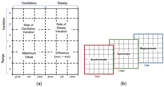 In order to address (a), we do not represent time-series data directly (as some previous works have suggested (see Section 2.3)); however, we instead consider patterns that describe the variation over time in the data obtained from the inertial sensors. Concerning (b), we consider extending the designs of image representations that have been previously proposed to allow for the inclusion of as many relevant patterns as needed [,]. Finally, in what relates to (c), we define the representations as a compound of consistent regions that are filled with pixels in a way that represent the pattern values as continuous lines.