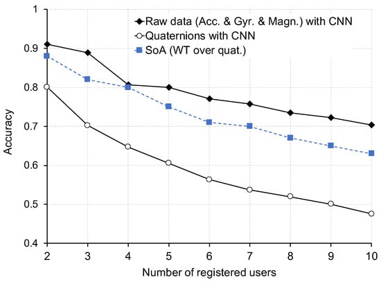 Moreover, as the size of the group of registered users became larger, the drop in accuracy became particularly pronounced, going down to as little as 0.63 for the case of 10 registered users. In this respect, our approach improves considerably upon the performance of this existing work, both in terms of the accuracy and robustness to changes in the number of registered users ( = 0.9487 for 23 users).