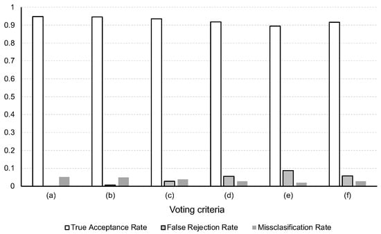 In Figure 11, we present the results for Experiment 2, which evaluated our approach for different voting criteria. As can be observed in the figure, the difference in the True Acceptance Rate is not considerable across the different criteria, with a difference of between the best case (i.e., first to plurality with ) and the worst case (i.e., winning by nine votes with ).