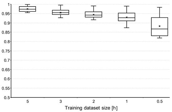 The results of this experiment are depicted in Figure 12. The average of the maximum values across all training sizes considered is 0.9915. On the other hand, the average of the minimum values across all training sizes considered is 0.8855.