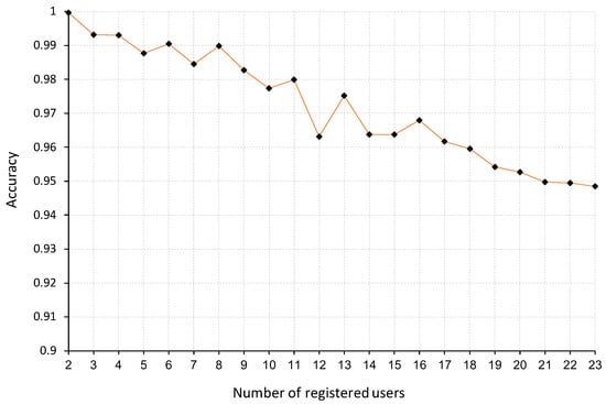In this experiment, we evaluate the difference in performance depending on the number of users registered in the system, as this is a known issue of identification approaches []. We evaluate our approach for as few as two registered users and all the way until 23 users to observe the difference in the performance throughout. The results of this experiment are obtained using 10-fold cross-validation.