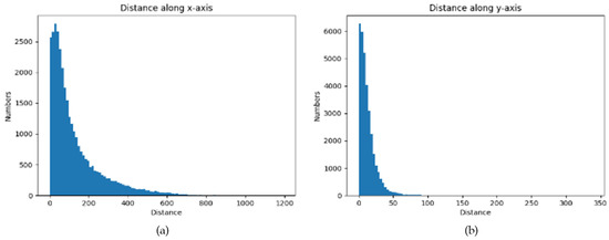 To prove that the small objects are near the vanishing point, an analysis of the real front camcorder images dataset, BDD100K [3] is carried out to see how the small objects are distributed in dash cam images. Some post-processing is carried out to perform the labelling in BDD100K and generate the vanishing point location, which is detailed in Section 4, and calculate the distance between the center of small objects, under 32 × 32 pixels, as defined in COCO [4] evaluation metric. The histograms shown in Figure 1 are of the small objects and the vanishing point distance along the x-axis and y-axis. Using small RoI with 640 × 360 resolution, an acceptable distance range of 320 pixels along the x-axis and 180 pixels along the y-axis is achieved in the histogram. The ratio of small objects in the acceptable distance range is 90.52% along the x-axis and 99.96% along the y-axis, indicating that by concentrating on the vanishing point, it is feasible to improve the distant small objects detection in a reasonable way.