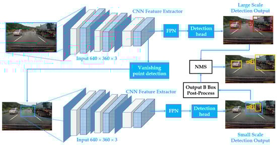 V. Růžička and F. Franchetti [5] indicated that object detection benchmarks like Visual Object Class (VOC) and COCO use low-resolution images, but nowadays, image-capturing techniques have been improved so that most of the images are above 1080p or even 4K. If we still use a low-resolution model input size, we will lose the details of small objects in the image. However, using a high-resolution model input size is wasting computation resources. The authors came up with a coarse-to-fine method to reduce computational complexity. First, they do attention evaluation, which roughly detects the whole image by resizing it into a low-resolution model input size. The bounding boxes obtained from the first stage are possibly contained objects, but not sure whether there are still some of the objects overlapping too much. In the second stage, they perform object detection again based on the result from the first stage, cropping the near region of each bounding box. Without down-sampling the image, more details are available. The detection result is more accurate. However, there are some disadvantages associated with this method. Since it is a coarse-to-fine method, if objects are too small that the first stage cannot find the objects, they will not be detected in the end. However, in driving applications, objects usually approach from far to near. Near objects’ locations cannot be used to find distant objects’ locations. Another disadvantage is that the computation is not saved sufficiently if those location distributions of objects are scattered, making the second stage filled with too much of active crops. The method proposed in this paper only needs one larger model input size for near objects and one small model input size for distant objects. Additionally, with the vanishing point detections, we can directly know the small object appearing region, without guessing based on near objects.