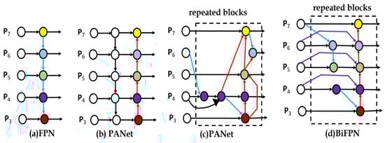 The FPN [2] is probably one of the first publications to claim the usage of a neck before the detection of dense heads that can enhance the detection of small objects. A few different kinds of necks such as Path Aggregation Net (PANet) [23], Neural Architecture Search-Feature Pyramid Network (NAS-FPN) [24], Bi-directional Feature Pyramid Network (BiFPN) [22], and so on shown in Figure 4 are proposed based on the FPN architecture dedicating to enhance the combination of high-level rich features and the low-level large receptive field features. In this paper, most of the experimental models use FPN as the neck as it is well known as a basic neck yielding competitive results with the same baseline.