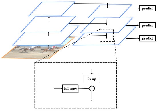 In the detailed architecture of FPN shown in Figure 5, each of the selected feature levels is passed through a 1 × 1 convolutional layer, and the high-level features are up-sampled to their previous level feature share, that is, double the size. Then, these two features are combined forming a new output and it is passed to dense heads.
