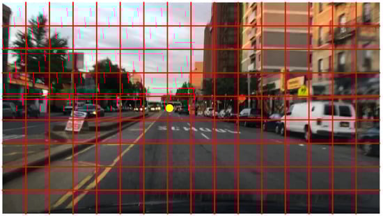 For the proposed ConcentrateNet to concentrate on detecting the traffic at a distance, the vanishing point subnet provides the possible furthest location in the input images. Since the classification process with fewer classes of objects to be detected for ADAS applications, it can be considered the simplest task in deep learning and thus easier to train and achieve high accuracy. As in Deep Learning for Vanishing Point (DeepVP) detection [28], the input image in the proposed work is roughly divided into grids, and the ground truth vanishing point is rounded to one of the grids. Then the classification method is employed to find the vanishing point as in an example shown in Figure 6. In Figure 6, the yellow dot is the vanishing point, and the grid within which it is located in the target of our vanishing point subnet. Although a rough sampling into a grid may cause an inaccurate prediction of an object’s location, it is not key in the proposed system to know the actual vanishing point. The detection of the probable location will suffice.