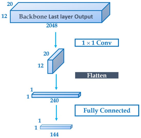 The architecture of the vanishing point subnet is shown in Figure 7. A 1 × 1 convolution is used to convert the rich features present in the output of the last layer of the backbone into vanishing point features that are usually remained in only one channel. Then the feature map is flattened into one dimension and connected with a fully connected layer and a softmax layer to carry out the classification of the detected objects.