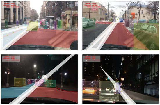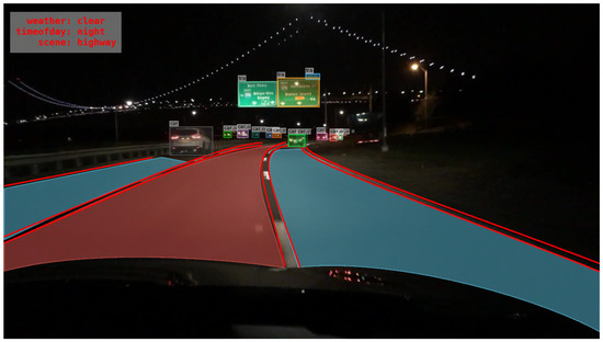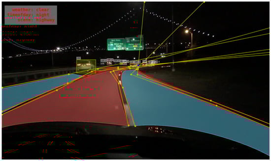 BDD100K dataset [3] by Berkeley DeepDrive, contains over a hundred thousand images, with diverse scenes like highways, city streets, tunnels, residential complexes, road intersections etc. The weather and illumination are also diverse, such as clear sky, cloudy, rainy, foggy, day and night conditions and so on. It is suitable for deep learning models to learn the various situations that may be encountered in real-time driving scenarios. The images in the aforementioned dataset are collected from cities in America in contrast to other famous datasets like Cityscapes [30], which comprises traffic environments images from European cities/countries. The BDD100K dataset has labeled object bounding boxes, drivable areas, lane separation lines, and other parameters required for the object detection of autonomous driving applications as in an example shown in Figure 9. The upper left of the image shows the weather, time of day, and scene information, the red lines show the lane separation lines of the road and the red and blue areas of the road indicate the drivable region. There is also information on the object bounding boxes.