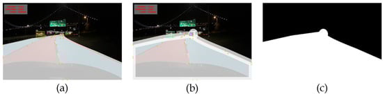 The overall process of filter generating flow is shown in Figure 13. First, the two sides of lane separation lines, the vanishing point, and the bottom boundary of the image to enclose a region are used. Since the region is too close to the edge of the driving road, the objects right beside the road are also considered to be detected in order to ensure safety; a wider RoI is used in this paper. Additionally, a vanishing point cannot fully cover the entire distant region, so a circle to enlarge the vanishing point region is adopted. As shown in Figure 13b, the RoI is dilated with 50 pixels, and the vanishing point circle uses a radius of 50 pixels. Finally, the generated bounding boxes RoI mask is shown in Figure 13c. If the whole bounding box of the object is out of the mask region, such objects are ignored and the object is not counted in evaluation metrics irrespective of it being detected or not.