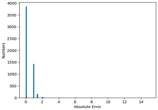 From Table 4, the top1 accuracy might seem not high enough with accuracy ranging from 60% to 70%, but the top5 accuracy is quite high reaching about 98%. The reason is that the ground truth vanishing point labels are generated by rule-based post-processing with the lane line labels, instead of manually labeling, leading to a not accurate enough ground truth. Besides, defining one precisely vanishing point coordinate is not easy. In this paper, the aim is to detect the objects in distant regions rather than the vanishing point, so obtaining higher top5 accuracy is considered satisfactory for the proposed ConcentrateNet. Table 3 shows the average error to the ground truth in the dataset, which is an important metric to evaluate the performance in the application perspective that only has to locate the distant region. The error is obtained by the absolute distance of prediction and ground truth coordinated with the unit grid. It can be noted that there is only about 0.4 grid error on average. Figure 15 shows the bar chart of the error in the validation dataset. The first bar with an error of 0 means the top1 class prediction is the same as that of the ground truth. The second bar with an error 1 indicates the prediction is right beside the ground truth. The third bar with an error of 1.414 means the prediction is on the diagonal side of the ground truth and the other bars with larger errors are in very few proportions. The average error of 0.4 grid is only in a small ratio compared to the small RoI used in the ConcentrateNet, which is used in the experiments with 640 × 360 pixels, that is 8 × 4.5 grids.