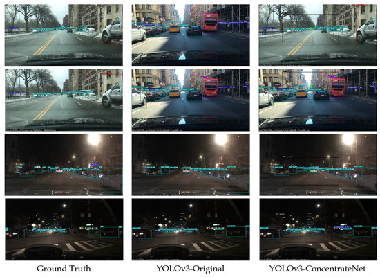 Some of the detection results visualizations of YOLOv3 original architecture and ConcentrateNet architecture in different real-time traffic scenarios under various lighting conditions are shown in Figure 16. The left column is the ground truth, the middle column is the bounding box predictions of YOLOv3 original architecture, and the right column is the bounding box and vanishing point prediction of ConcentrateNet architecture, which draws the vanishing point with a yellow circle and small RoI region with a black rectangle. It can be noted that the original architecture misses some of the farthest objects, while with the proposed ConcentrateNet architecture, the model can detect better even in distant regions, which is crucial for the vehicles driven at high speeds to detect the objects at far and still have sufficient time to react and prevent a probable collision.