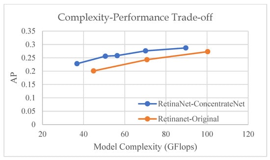 Different model input sizes are used to evaluate the performance of the proposed method under different model complexity and a comparison graph is plotted, using detection model RetinaNet as an example, as shown in Figure 17. It shows that Retinanet with ConcentrateNet architecture has the best complexity-performance trade-off.