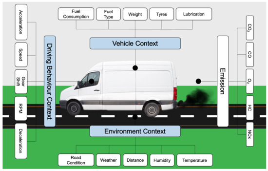 In this research, contextual data [28] regarding three different areas of impact on emissions are gathered. These contexts include environment, vehicle and driver behaviour contexts. Each of these contexts have certain parameters which can effect the GHG emission rate. Figure 1 shows the impacting contexts and related parameters.