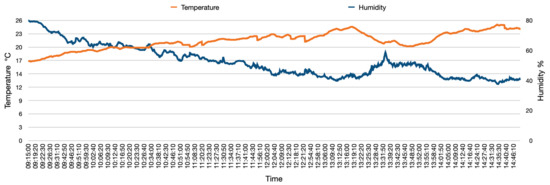 The data collection was captured during the autumn season with a temperature range between around 17 °C to 26 °C. The ambient temperature and humidity were recorded to ensure that the range of these two factors is within the operational range of the gas analyser sensor. Figure 6 shows the ambient temperature and sensor thorough the delivery process.