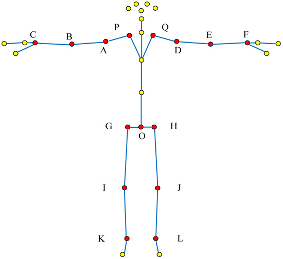 Select the overall joint point of the action (The red dot is the selected bone joint in this study, and yellow dot is bone joint point that do not need to be considered in this study. The letter is the code of selected bone joint corresponded to Table 1).