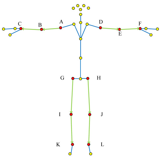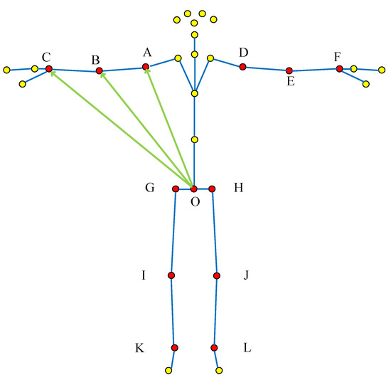 In terms of joint feature vector selection, the traditional joint feature vector is usually a vector formed by connecting adjacent bone joint points. For example, the vector formed by the right shoulder A and the right elbow B is used as the feature vector, and this traditional selection method is named the “adjacent joint method”.
