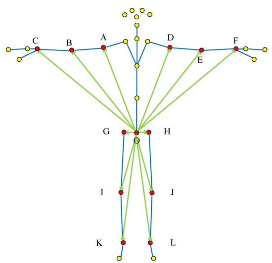 The overall “pelvis divergence method”: According to the selection characteristics of this method, the hip joint is used as the starting point, and the joint points corresponding to the upper and lower limbs are used as the vector end points to construct feature vectors, as shown in Figure 4.