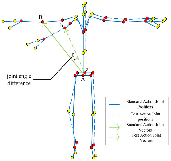Taking the “pelvis divergence method” as an example, the degree of movement difference is determined by selecting the angle difference formed by the same joints in the standard action and the test action as the feature quantity, as shown in Figure 7. The higher the degree of similarity of actions, the smaller the angle difference formed, and the specific value of the angle can be obtained from the cosine theorem: