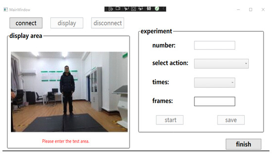 Experimental hardware system: one Azure Kinect sensor, host computer: Intel Core i7; 16 GB memory, NVIDIA GeForce RTX 3060 graphics card. The standard development environment is: Windows 10 operating system, Visual Studio 2019 and Matlab R2018a. The WPF (Windows Presentation Foundation) platform is used to build the experimental data acquisition interface. The interface includes modules such as image display area, action selection area, and status functional area. See Figure 8 for details.