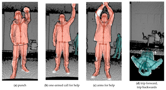 Accordingly, combined with the characteristics of Kinect equipment, according to the above survey results and related literature [37,38,39,40], five unsafe behaviors—punching (fighting and fighting), one-armed call for help, two-armed call for help, falling forward and slipping backward—were selected as the action recognition objects.