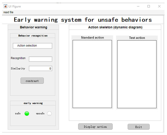 Through the identification system, the standard action and the test action are compared. According to relevant research [46], if the similarity between the standard action and the test action exceeds 75%, it is deemed to have made unsafe behavior, and the red indicator light is on. If the similarity is less than 75%, it is considered as safe behavior, and the green indicator light is on. The system interface is shown in Figure 10.