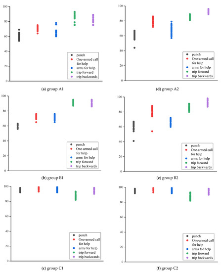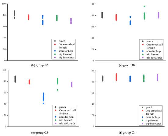 According to Figure 13a, the recognition results of most actions are in descending order of group C, group B, and group A. Among them, the overall results of group A are quite different from those of groups B and C. The difference between the results of the two groups is small; according to the numerical trend, the similarity results between each action category in the group A are between 51.2% and 73.2%, and the gap is large, indicating that the stability of the action similarity is low. In contrast, the similarity of group C ranges from 75.1% to 84.5%, the recognition results for each action are generally concentrated, and the gap between the maximum and minimum values between action categories is small.