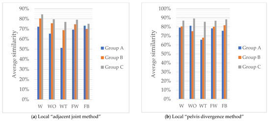 The similarity scores of each action obtained by the local “adjacent joint method” and “pelvis divergence method” recognition models are averaged, and the results are shown in Figure 13. Comparing and analyzing the recognition results of the local “pelvis divergence method” and the local “adjacent joint method”, only the similarity of single-arm and double-arm calls for help in group B decreased slightly, by 0.4% and 0.9%, respectively. The similarity of other actions has been significantly improved. The most improved similarity is the single-arm call for help in group A, which has increased by 15.9%. It is confirmed that the “adjacent joint method” is easily affected by factors such as the different body shapes of the action objects and the body offset during the recognition process, thereby reducing the similarity of the recognition results. Therefore, the “pelvis divergence method” can obtain higher similarity.