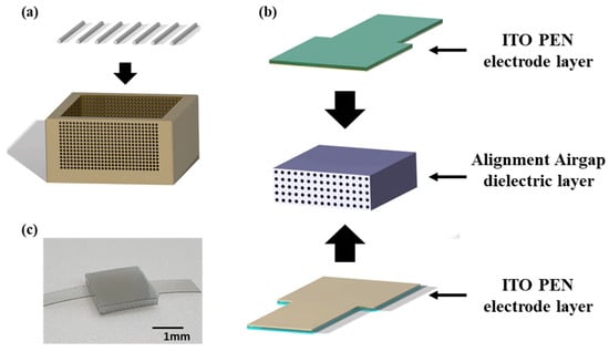 The mold and micro-needle for the generation of alignment airgaps were designed as shown in Figure 1a. The mold for manufacturing the dielectric layer was fabricated with an internal size of 20 mm × 20 mm × 3 mm. It was fabricated with an aluminum alloy (A6061) with airgaps of 300 μm, 400 μm, and 500 μm, and spacings of 1 mm, 1.5 mm, and 2 mm to form alignment airgaps. The micro-needle was fabricated with a length of 70 mm for penetrating the mold. The alignment airgap dielectric layer was formed by molding an Ecoflex (Ecoflex shore 00-30, Smooth-on Inc., Macungie, PA, USA) elastomer solution inside the mold. The Ecoflex solution was prepared by mixing the base and hardener in a weight ratio of 1:1. After combining the mold and micro-needle, it was soaked in the prepared Ecoflex solution and degassed in a vacuum chamber for 30 min. After hardening in a drying oven at 60 °C for 2 h, the dielectric layer was separated and the dielectric layer of an alignment airgap structure was formed. The fabrication process of the alignment dielectric layer is shown in Figure S1. A flexible sensor was fabricated by integrating the manufactured alignment airgap dielectric layer between film electrodes using a 125-μm-thick polyethylene naphthalate (PEN) coated with a 180 nm thick layer of indium tin oxide (ITO, MTI Korea, Seoul, Korea) as the electrode of the pressure sensor, schematically shown in Figure 1b. The photograph of the prepared pressure sensor of the alignment airgap type is shown in Figure 1c.